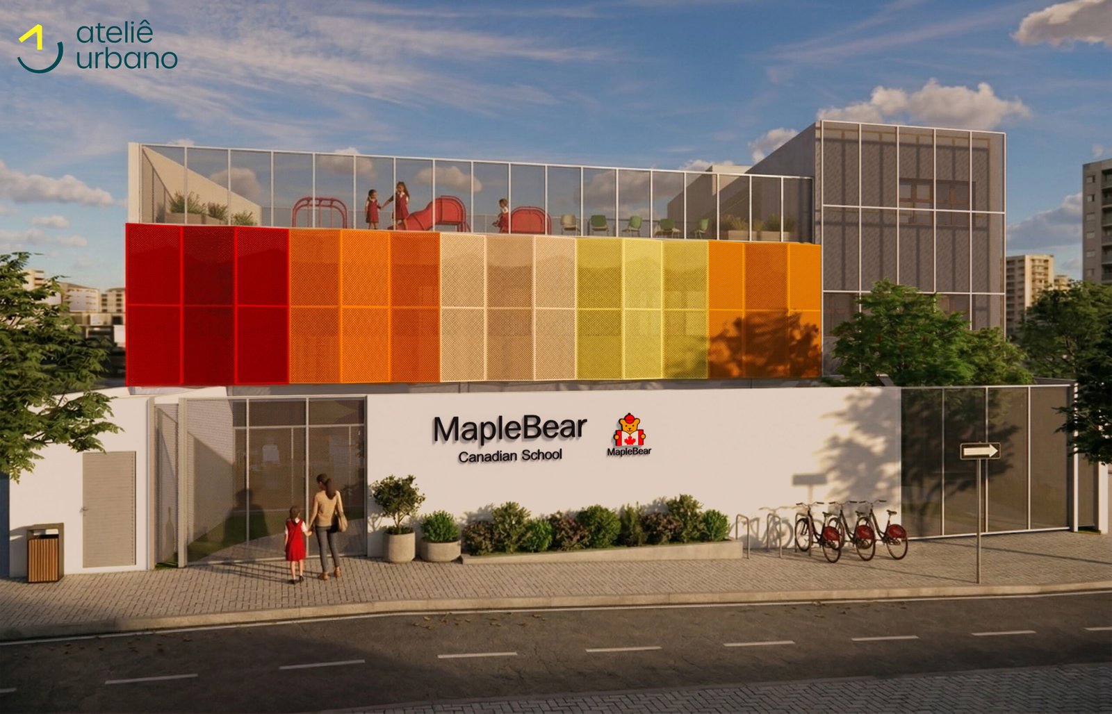 A fachada da escola é um dos destaques do projeto, com um brise colorido que segue a paleta de cores da Maple Bear, trazendo um toque lúdico e vibrante, sem perder o frescor e a identidade visual da instituição.