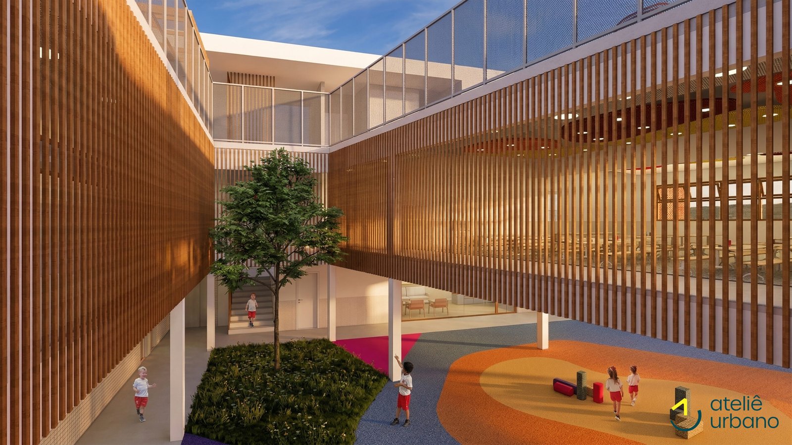 No térreo, o projeto contempla o drive de entrada de alunos, recepção, quatro salas de aula dedicadas aos alunos mais novos e um pátio coberto com piso emborrachado antimpacto, ideal para atividades recreativas seguras. Além disso, há um parque ao ar livre, especialmente desenvolvido para as crianças menores.