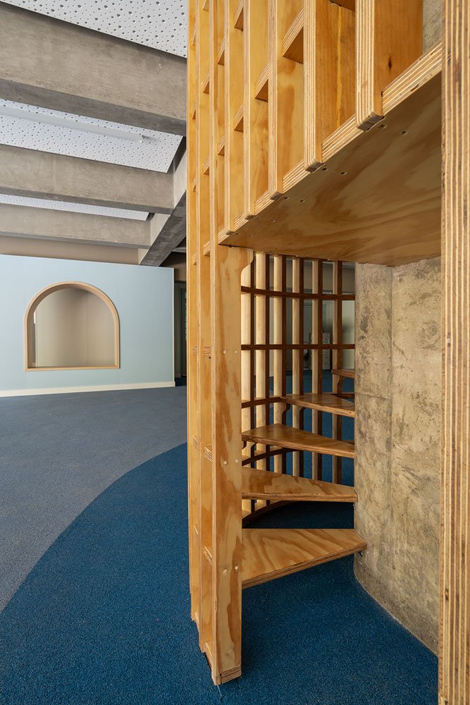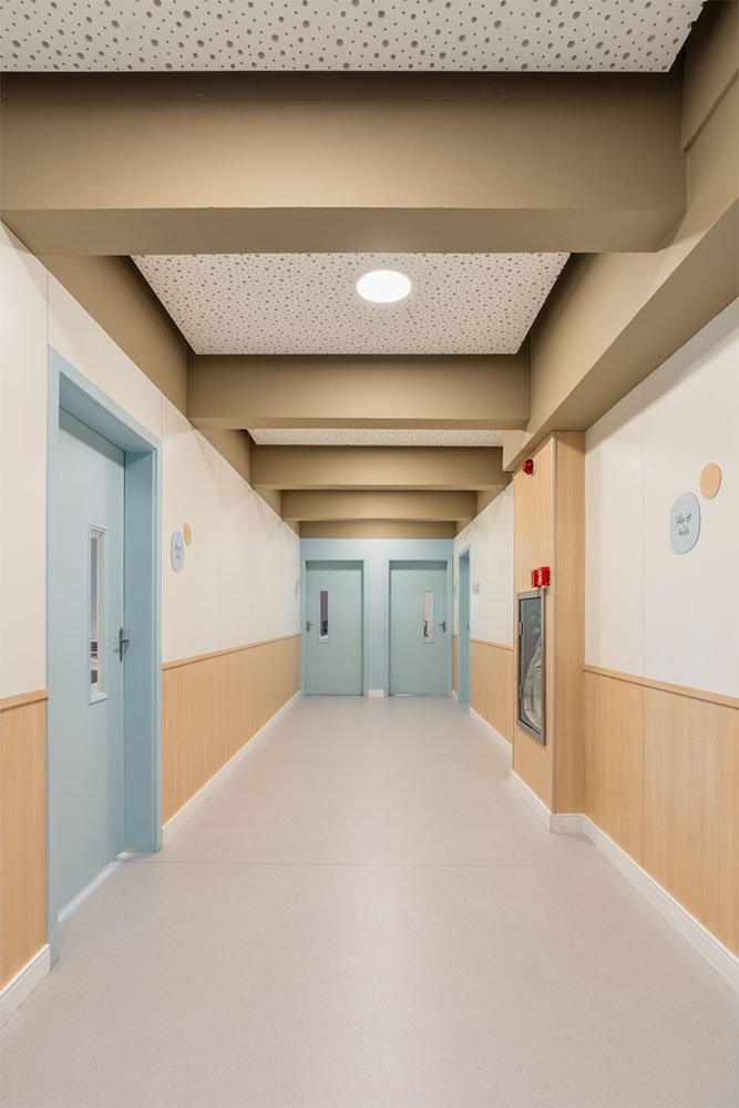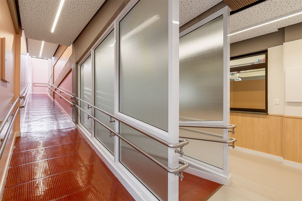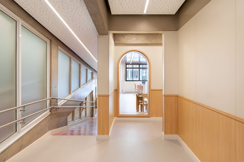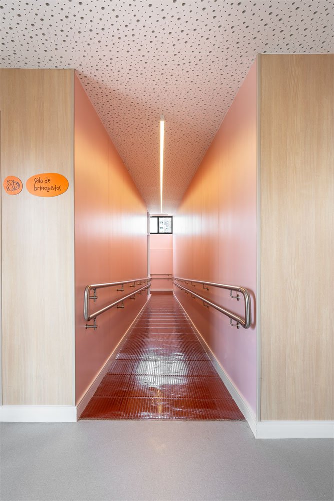 O projeto também contemplou a remodelação dos corredores internos e das rampas do edifício. Nestes espaços de circulação e transição, a intenção era criar uma atmosfera mais acolhedora e estimulante.