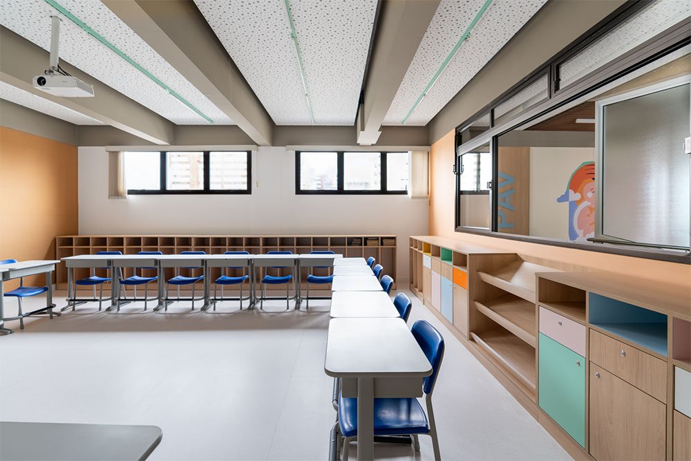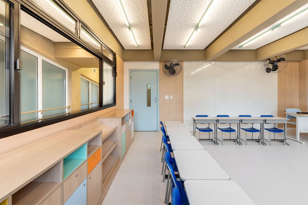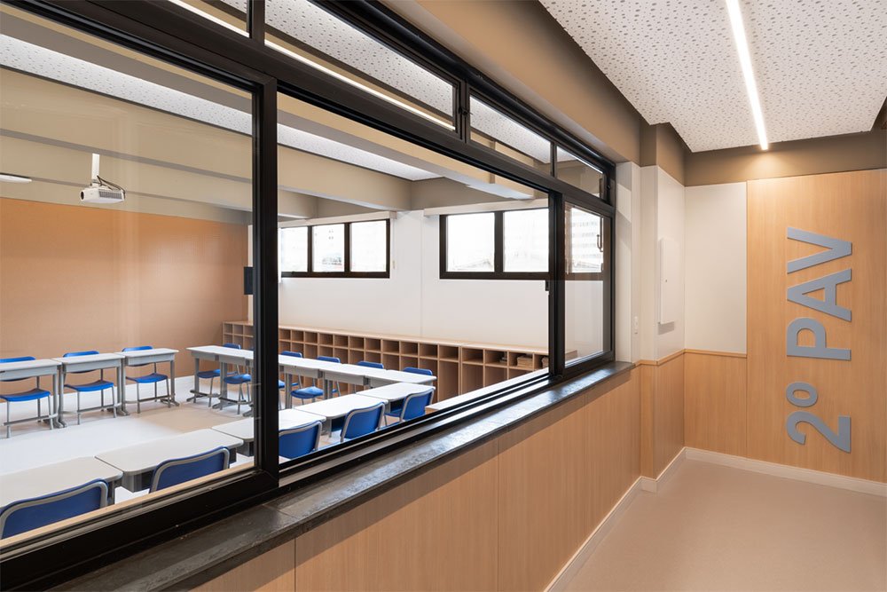 Os dois pavimentos destinados às salas de aula foram projetados com o objetivo de criar ambientes inspiradores e confortáveis para o aprendizado.