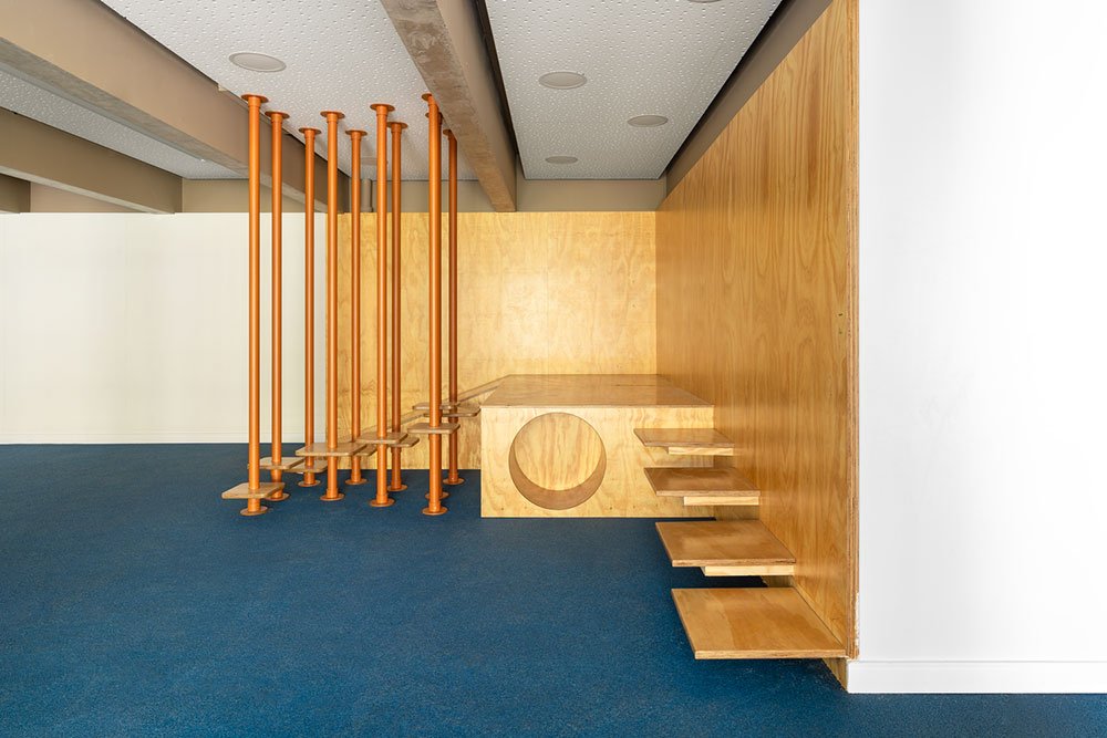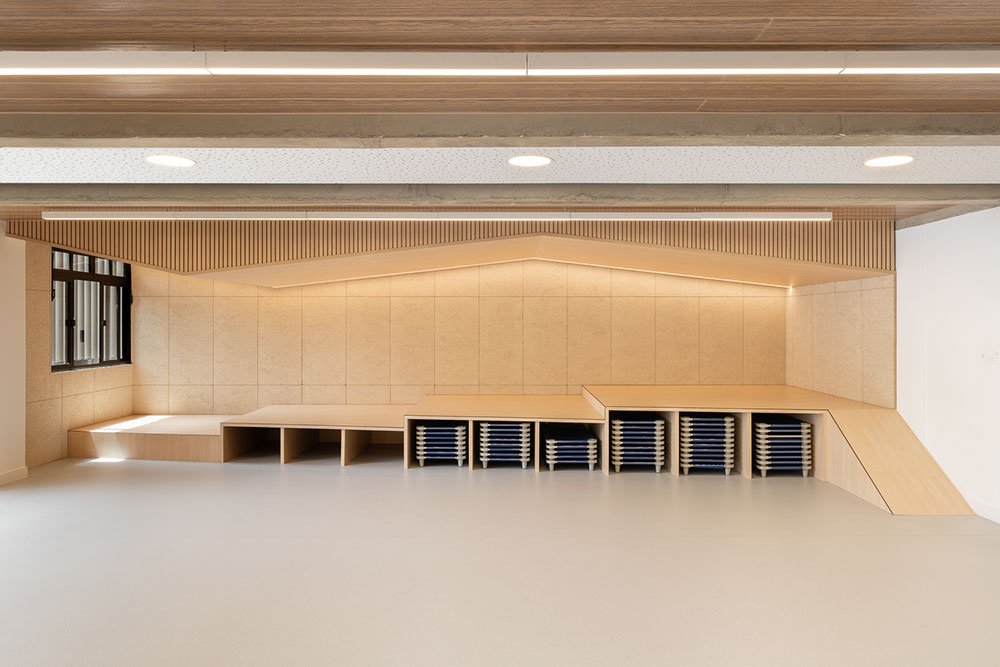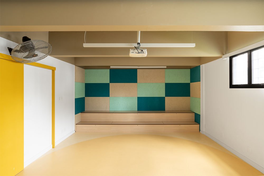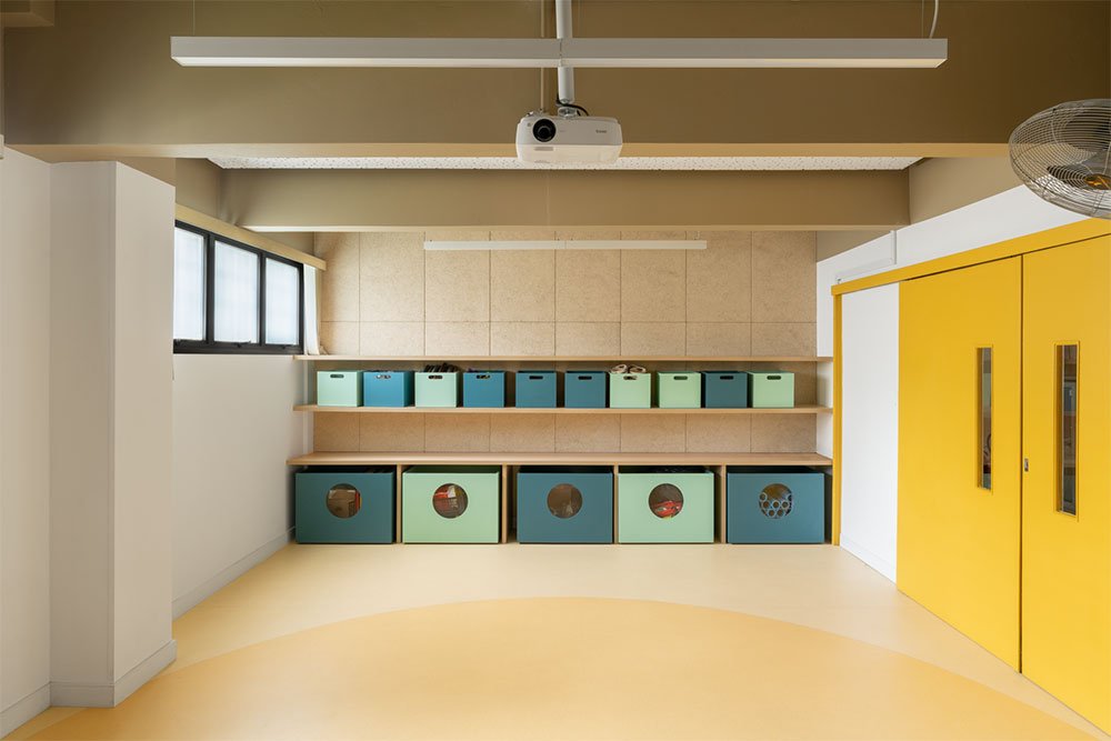 O palco também serve como espaço de armazenamentos das caminhas empilháveis. Os visores para o corredor compõem um painel com prateleiras para livros e brinquedos e uma lousa de giz.