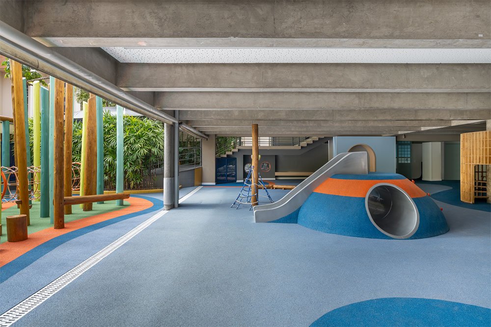 O piso de EPDM, um material durável e antiderrapante que garante a segurança das crianças durante as brincadeiras, é um dos destaques do projeto. Essa escolha foi feita visando proporcionar um ambiente seguro e confortável para que as crianças possam se divertir sem preocupações.